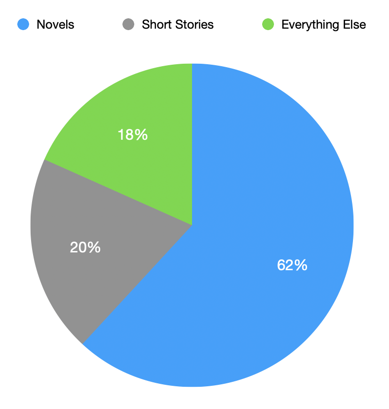 However you break it down, this is a record effort for my new vocation and it pleases me. I’m encouraged that I spent the bulk of my year on novels, as I’m convinced this is where my career needs to go. I’ll continue to write short stories during breaks on longer work, but I went into this to become a novelist and I hope to achieve that goal soon.